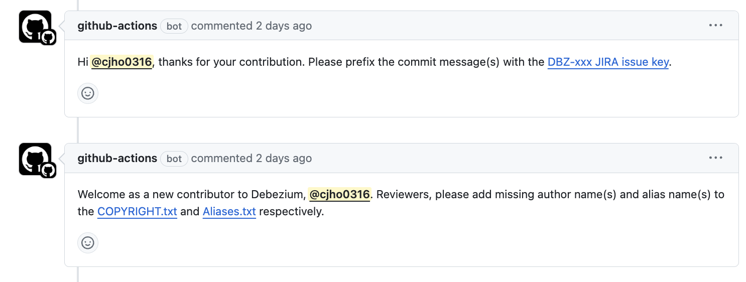 documentation 같은 경우는 커밋메세지를 prefix로 [docs]또는 DBZ-xxxx로 해야한다고 요청을 받아서 바로 rebase하고 커밋메세지를 수정했다. (브랜치 이름도 default 브랜치 이름으로 썼는데 가급적이면 DBZ-xxxx 로 하는것이 좋을것 같다고 생각했다.)