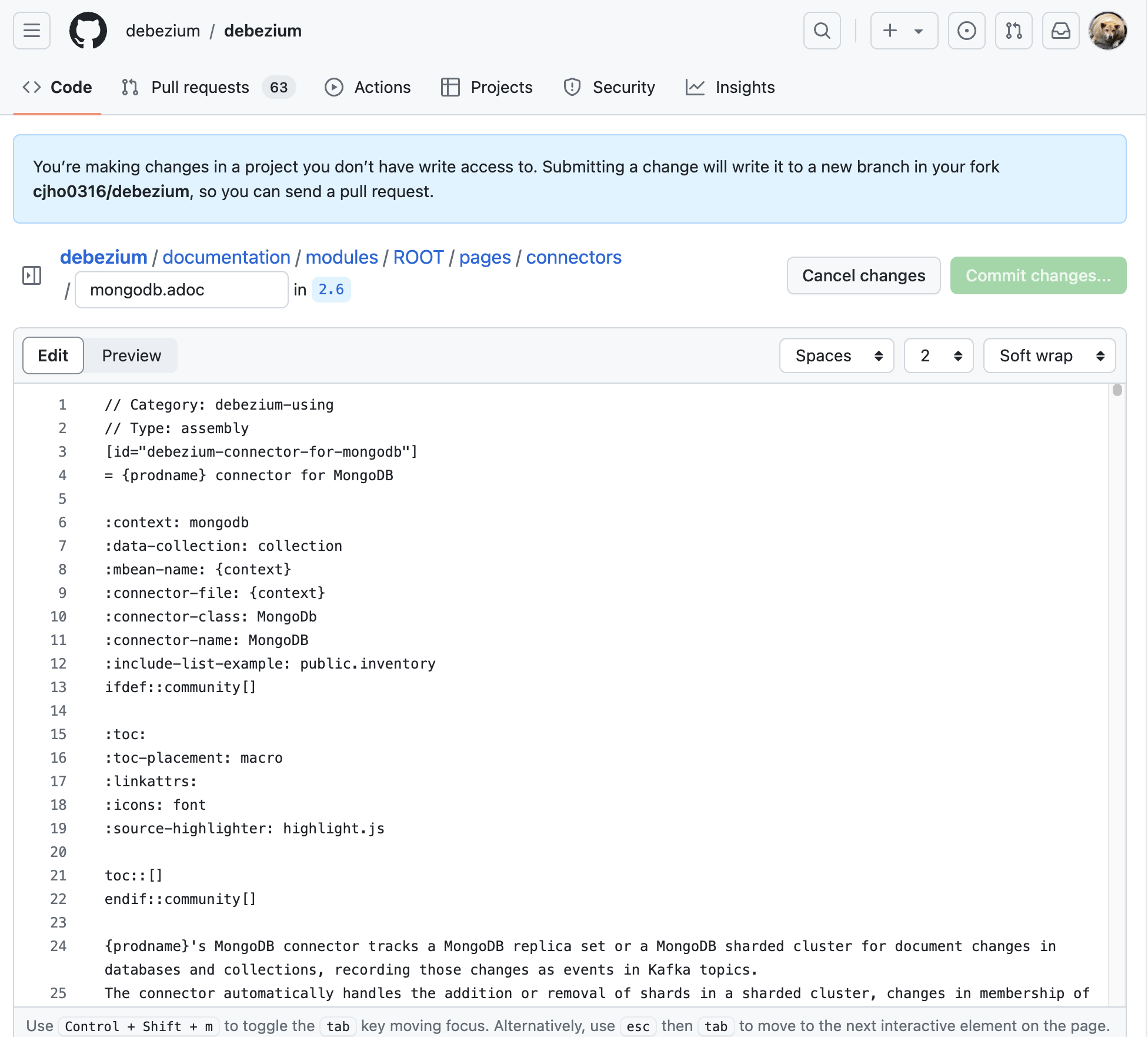 데베지움 몽고디비 커넥터에 대한 문서를 읽다가 수정해야할 부분이 있으면 우상단에 'Edit this Page' 를 클릭하면 문서 정보를 담고있는 깃헙 레포로 리디렉션된다. 모든 오픈소스는 기본적으로 기여를 하려면 해당 레포를 포크를 통해 본인 레포로 받아와야 한다.