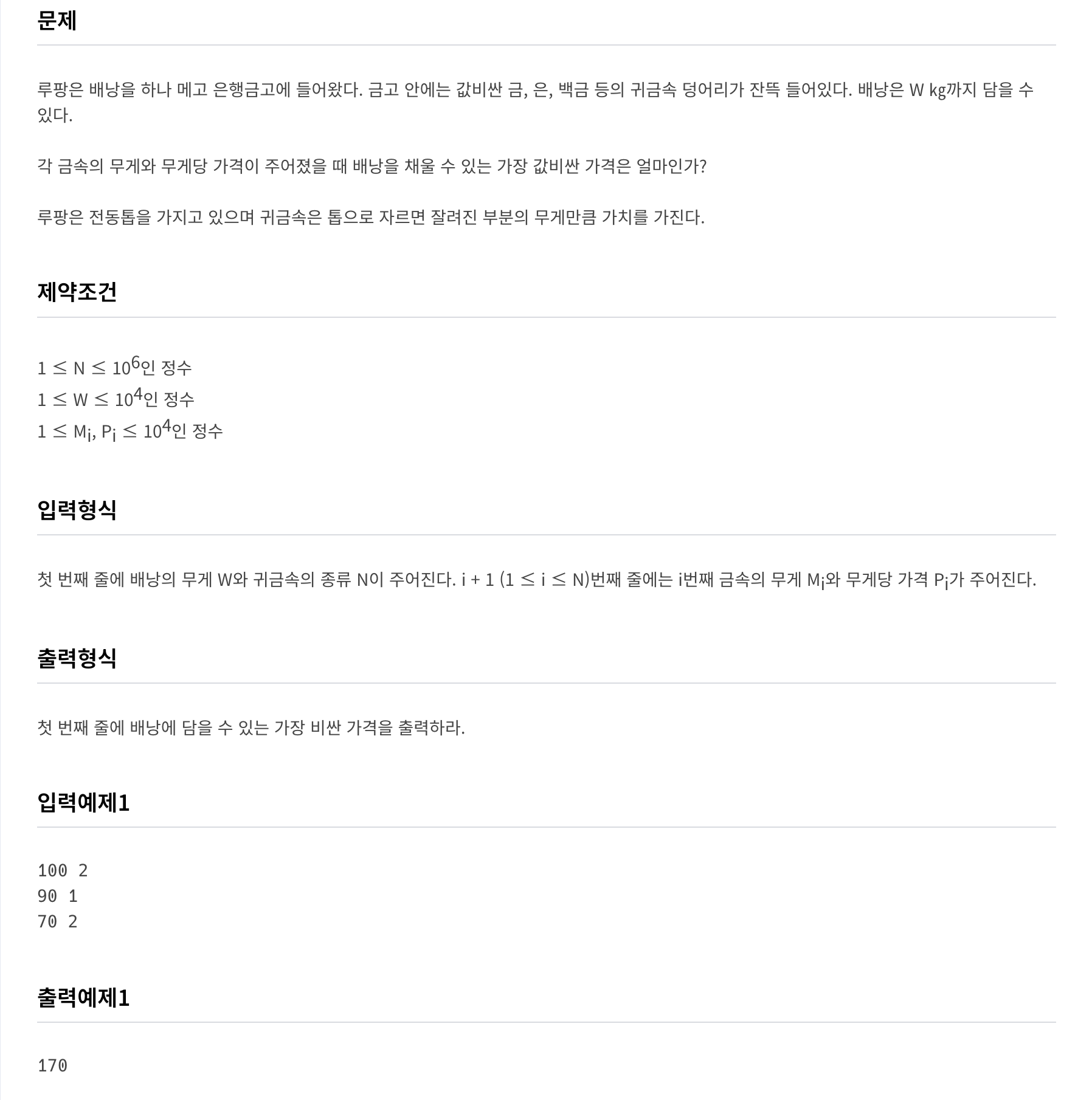 밸류값을 기준으로 소팅하고 제한된 W에 알맞게 가져가도록 코드를 구성했다.