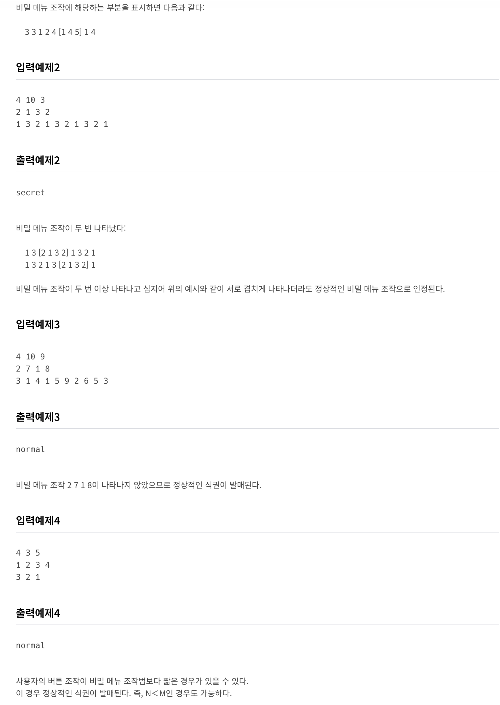 문제가 복잡해보이지만 리스트 슬라이싱을 통해 비교하고 조건에 맞는다면 "secret" 을 출력해주면 된다.