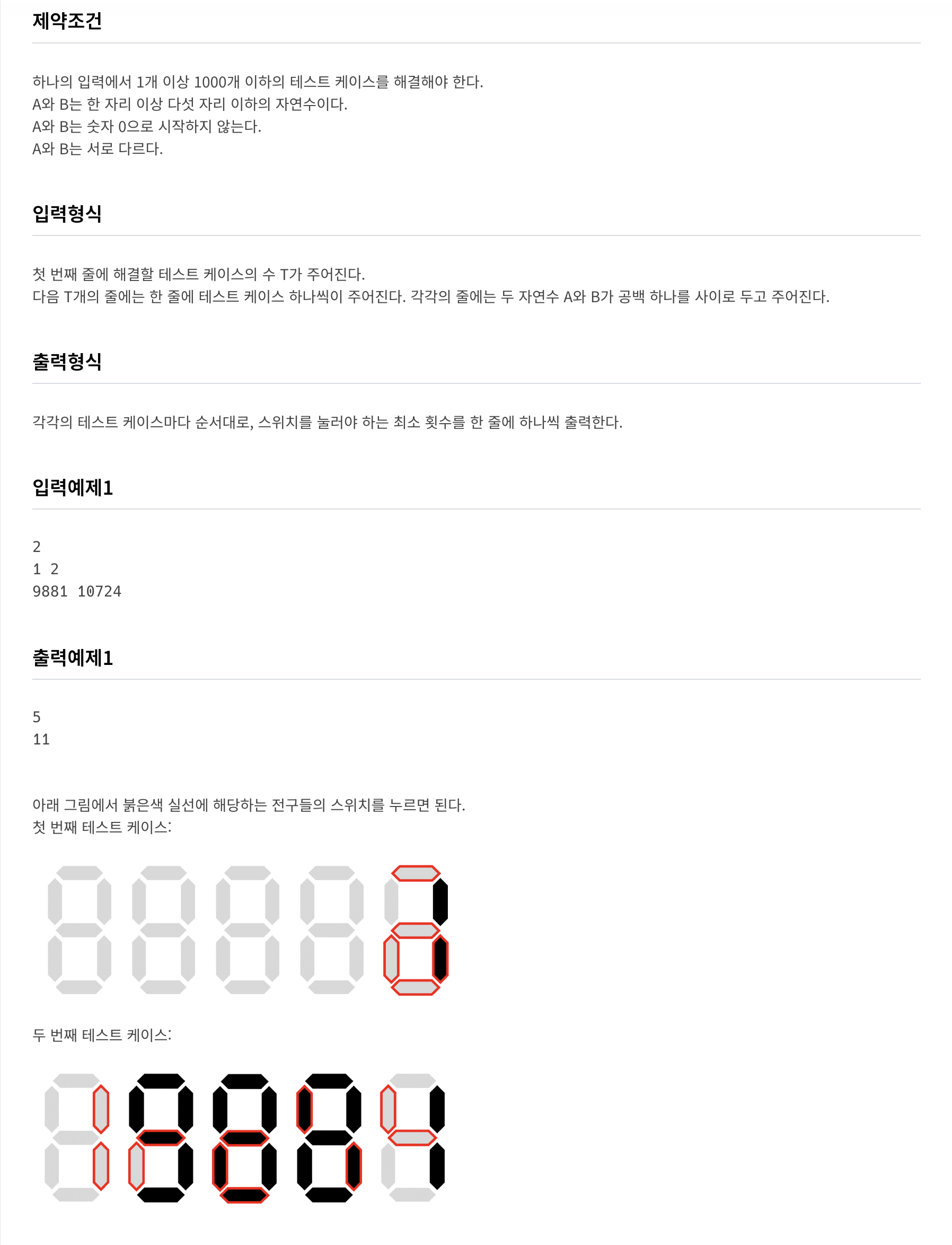 처음 생각한건 (ON + OFF)횟수 테이블을 만들어서 A 에서 B로 가는 서로의 숫자만 안다면, 점등 되어있는 불빛의 차로 어떻게 할 수 있지 않을까? 생각했었다.