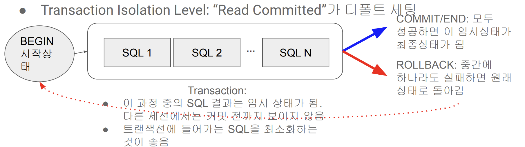 - Atomic하게 실행되어야 하는 SQL들을 묶어서 하나의 작업처럼 처리하는 방법