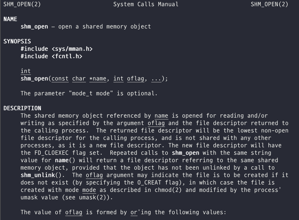 shm_fd = shm_open(name, O_CREAT | O_RDWR, 0666);