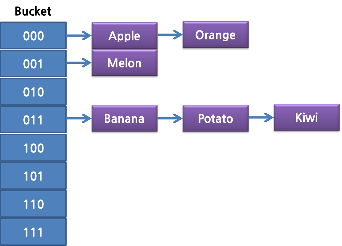 - 복잡하지 않아서 주로 사용된다. 많이 들어갈 때에만 중요하고 bucket을 빨리 늘리는 구조로 만들어서 구현하는게 더 효율적