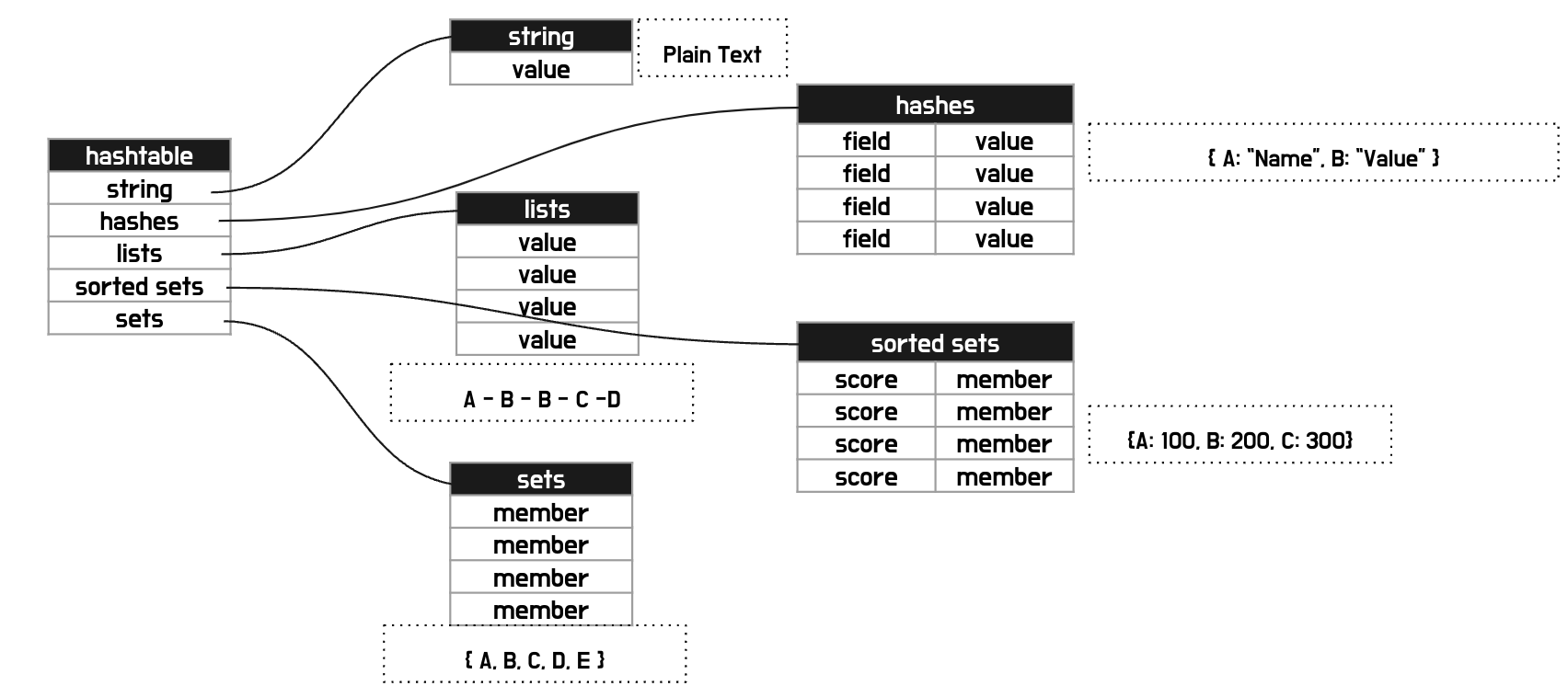 - Redis 에서 데이터를 표현 할 때 기본 타입은, 하나의 key - (하나 이상의 Field/Element) value 값으로 저장된다.