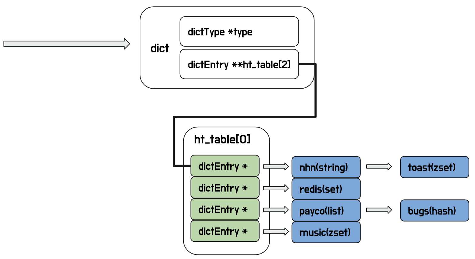 - Redis에서는 선형리스트 갯수를 줄이는 방식을 채택한다. linked list 테이블에 두배의 버킷을 할당하고 key를 복사한다.