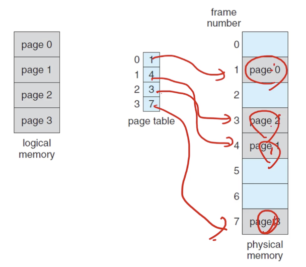 - page number는 페이지 테이블에 따로 관리되어야 함. 몇번 페이지에 몇번 오프셋에 있는지 찾아가는 과정을 가진다.