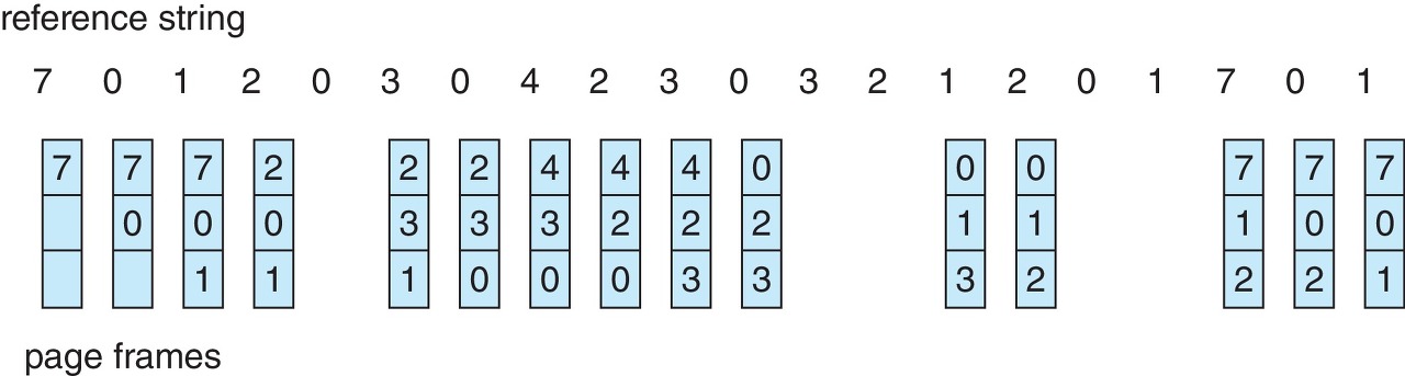 - page replacement algorithmns 의 평가기준 : page fault 의 비율을 낮춰야 한다.