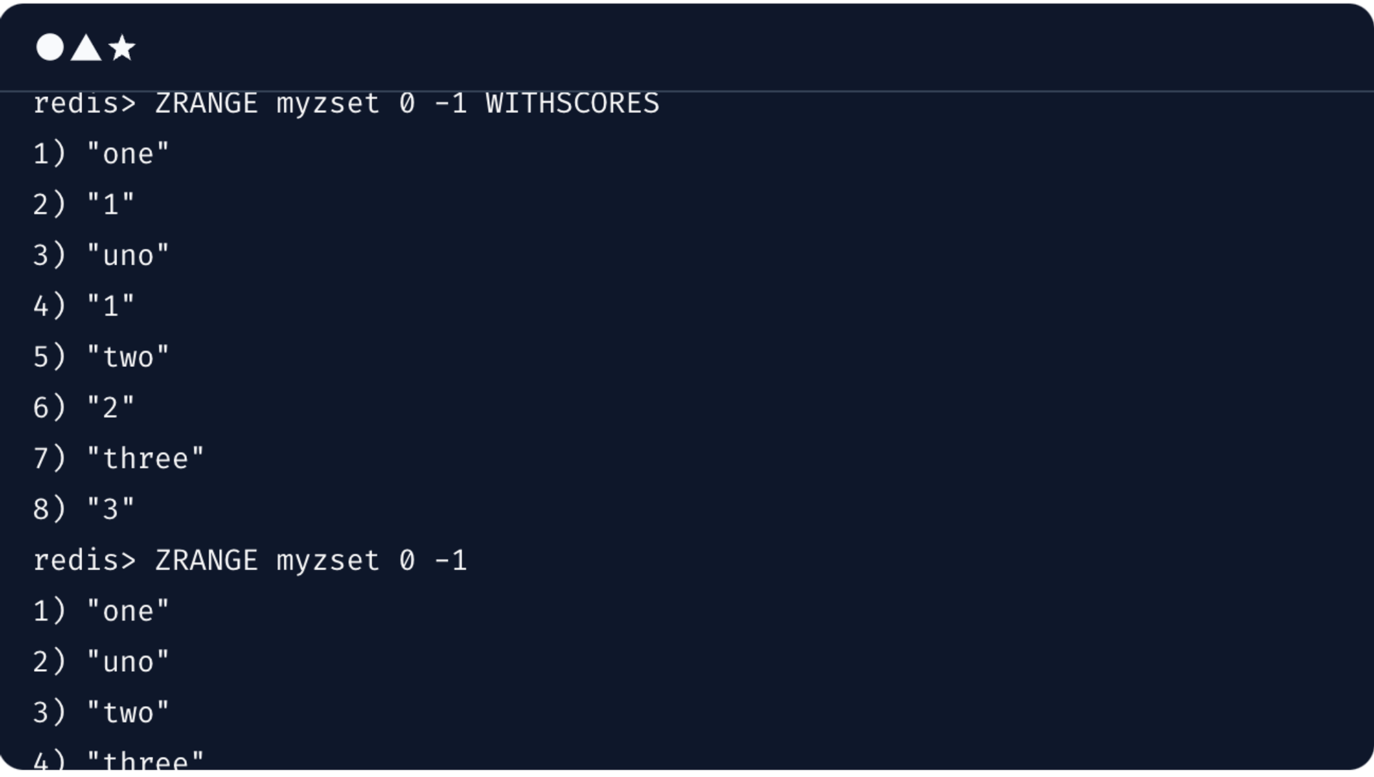 - redis cli : ZADD myzset 2 "two" 3 "three"