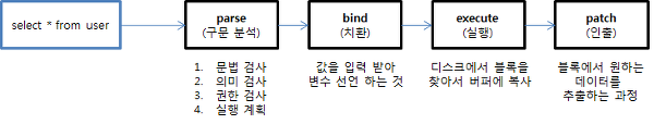 우리가 select 쿼리를 보내면 DBMS내부에서 문법을 검사할 때 (parse, bind, execute, patch)의 프로세스를 거쳐 출력하게 된다.