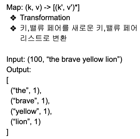 - 출력:입력과 동일한 키,밸류 페어를 그대로 출력해도 되고 출력이 없어도 됨