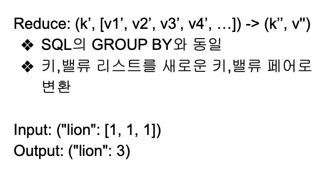- 맵의 출력중 같은 키를 갖는 키/밸류 페어를 시스템이 묶어서 입력으로 넣어줌
