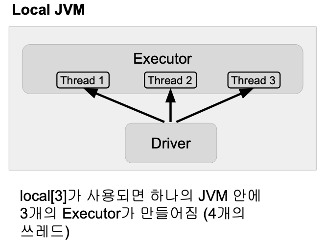- 하나의 JVM이 클러스터로 동작: Driver와 하나의 Executor 실행