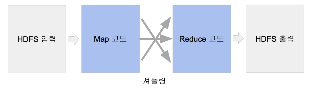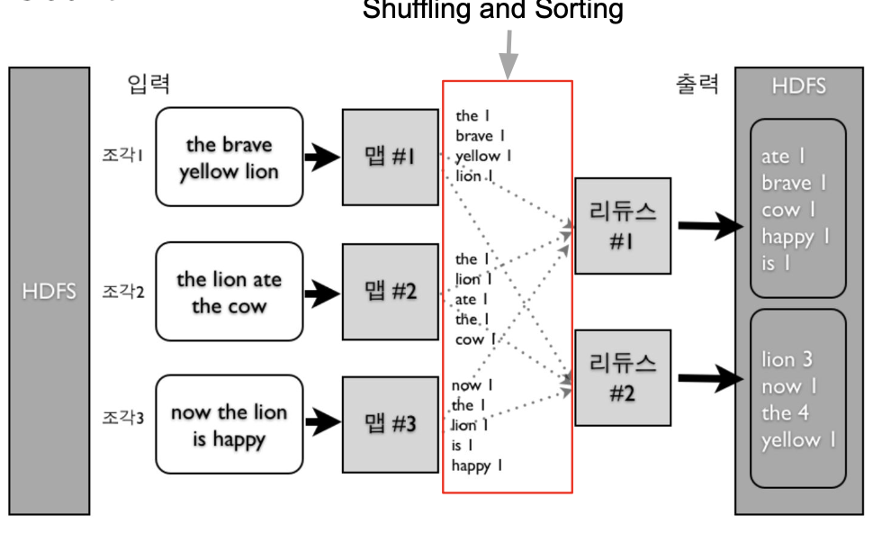 - 맵리듀스 시스템이 Map의 결과를 Reduce단으로 모아줌
