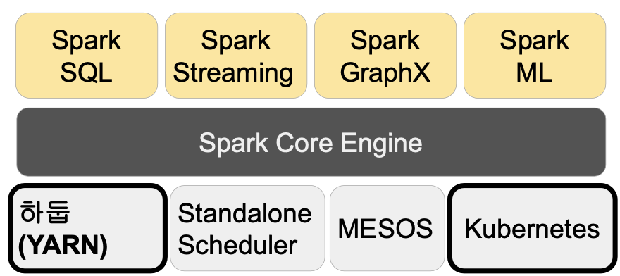 - Spark은 하둡(YARN)이외에도 다른 분산 컴퓨팅 환경 지원 (K8s, Mesos)