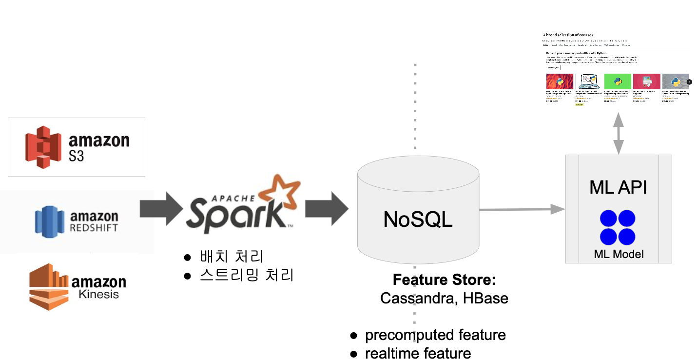 - 계산된 피쳐를 NoSQL에다가 저장해둔다. (데이터 사이즈가 작으면 Redis 사용도 가능)