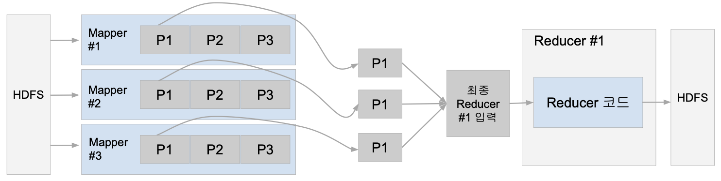 - 모든 Mapper의 출력을 Reducer가 받으면 이를 키별로 소팅