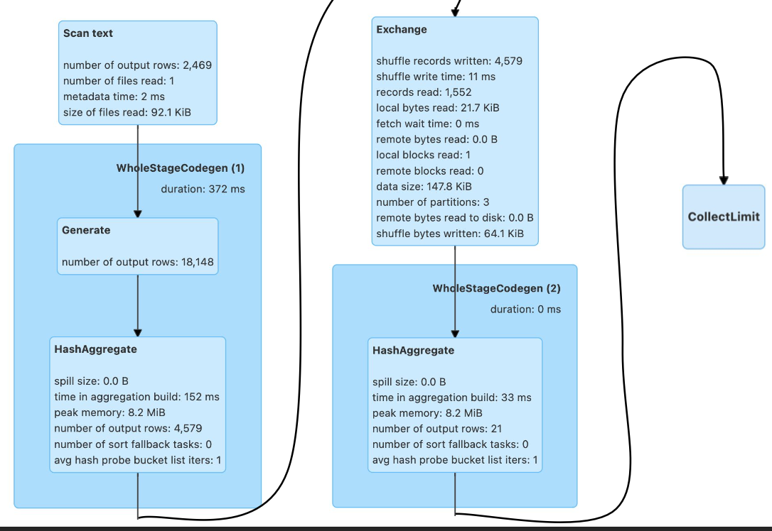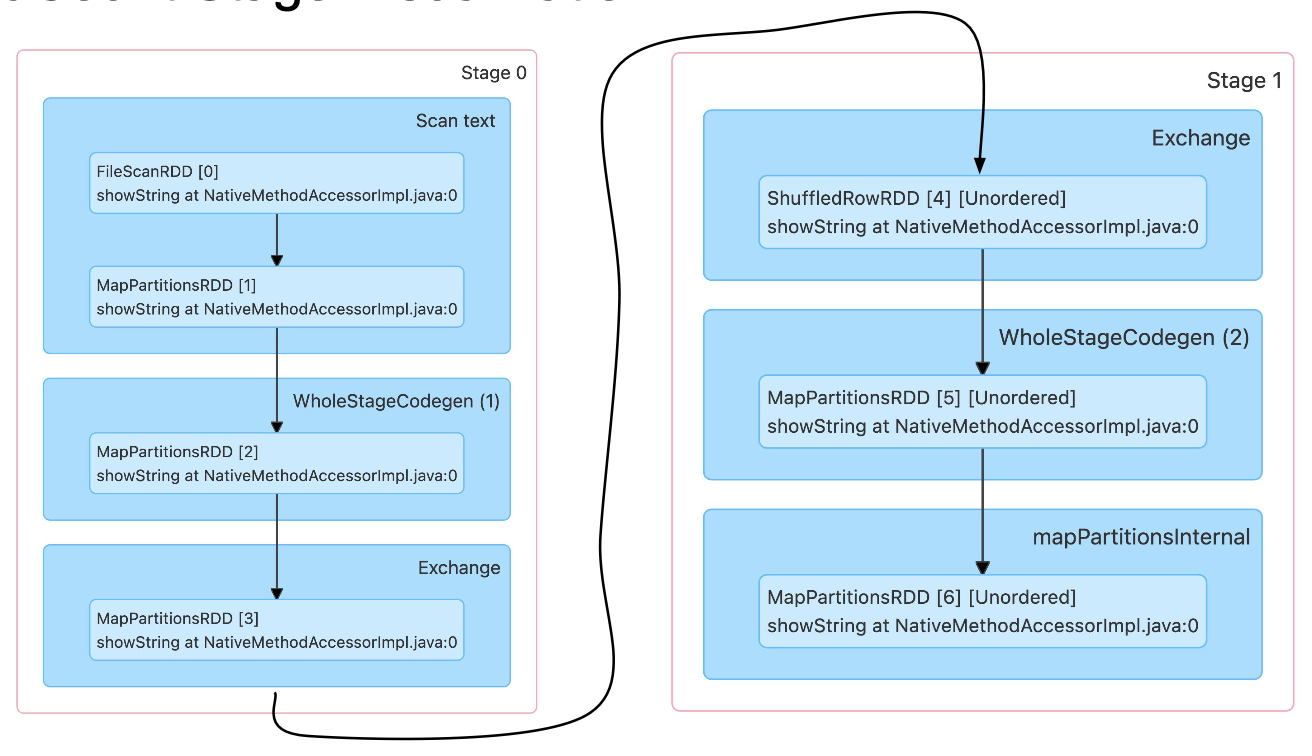 - 위 'Transformations and Actions' 에서는 csv의 헤더가 존재하는 것을 표시해주었기 때문에 job이 생성되었는데, WordCount 에서는 df.value 를 split함으로써 job을 생성하지 않게 된다.
