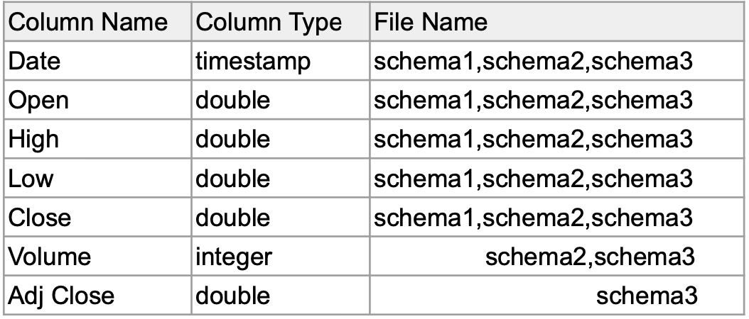 (아래의 표와 같이)서로 다른 스키마를 갖는 3개의 parquet파일을 받는다.