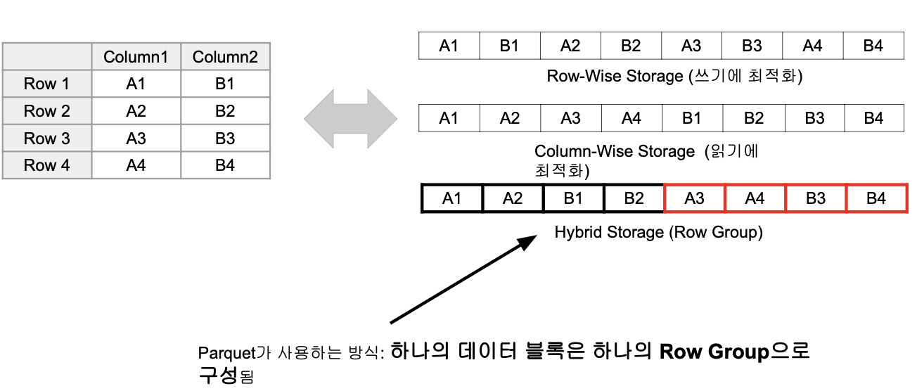 - Hybrid Storage (Row Group) : 데이터 단위로 그룹이 생성됨.